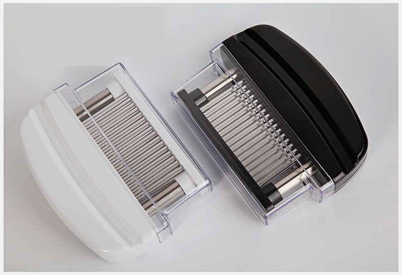 SAFE AND EASY TO USE – Manufactured to an extremely high standard, with food grade ABS plastic and 48 stainless steel blades, this sturdy constructed device has an engineered spring unit that cleverly retracts the blades to safety having pierced cleanly and easily through your meat. It features an ergonomic shape to comfortably fit your hand; simply push down on the device to use, activating three rows of super strong, ultra sharp blades.